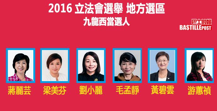 民建联蒋丽芸、经民联梁美芬、小丽民主教室刘小丽、公民党毛孟静、民主党黄碧云、青年新政游蕙祯。
