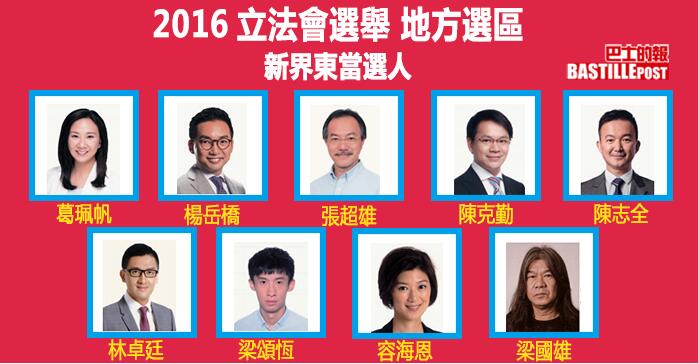 民建联葛佩帆、民建联陈克勤、公民党杨岳桥、工党张超雄、人民力量陈志全、民主党林卓廷、青年新政梁颂恒、社民连梁国雄、新民党容海恩。