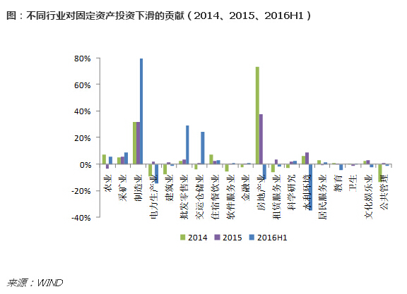 我們從固定資產投資下行這個角度來看這個問題,如果把過去三年不同行業對固定資產投資下滑的貢獻度拿出來,就會發現2016年上半年明顯拖累固定資產投資的行業,除了采礦業和制造業之外,批發和零售業和交通運輸、倉儲和郵政業這兩個行業的投資下行很明顯。