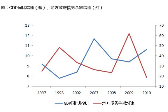 來源:審計署《2011年第35號:全國地方政府性債務審計結果》,上圖2002年增長率為1998年至2002年年均增長率,2007年增長率為2002年至2007年年均增長率,GDP同理
