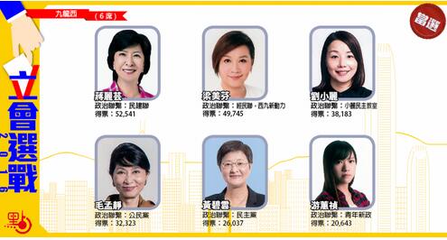 立法会换届选举九龙西地区已公布结果,结果当选的全为女将,包括民建联蒋丽芸,得票52,541票;经民联梁美芬,得票为49,745,这两名爱国爱港阵营的女将均成功连任。