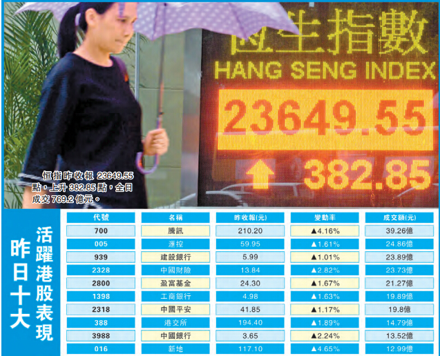 美国联储局9月加息机会降温,是继深港通开通消息後大市另一重大刺激因素。昨天升市由腾讯(700)及控(005)两只重磅股合力舞高,贡献恒近200点,其中腾讯升4.1%报210.2元,创上市新高,其市值更迫近2万亿元;控一度重越60元关,收市升1.6%报59.95元,创9个月新高;友邦(1299)重上50元关,收市升0.9%报50.4元。