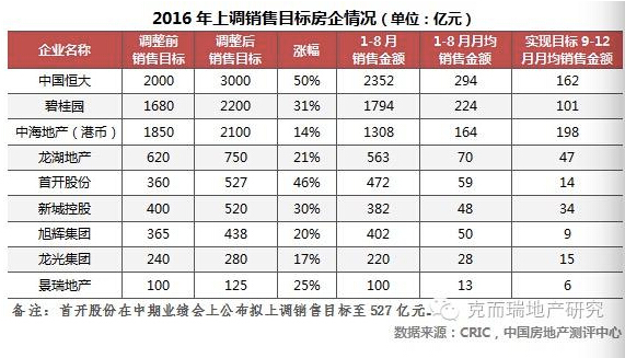 房地產研究機構克而瑞分析認為,銷售向好是房企積極上調目標的促因,就目前房企累計銷售情況來看,多數企業已完成調整后目標的70%,與全年目標差距不遠,如碧桂園實現銷售目標只須9-12月月均分別銷售101億元,根據上半年的銷售表現,壓力并不大。