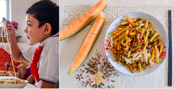 在新疆乌鲁木齐市,乌鲁木齐市第12小学的四年级学生祖力皮佧尔·阿尔肯在家吃妈妈准备的午餐──拉条子和哈密瓜(9月2日摄)。拉条子是一种新疆美食,也被称为“拌面”。