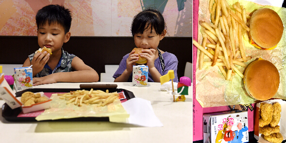 在河南省郑州市金水区,6岁的王俊晔和龙凤胎姐姐王昱*在一家快餐店吃午餐──薯条、汉堡、炸鸡块和牛奶(8月24日摄)。由于父母工作忙,姐弟俩经常吃附赠玩具的快餐。