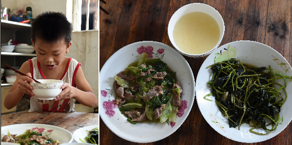 在广西南宁市仙葫开发区那舅社区那平村,今年9岁的韦成伟与父母、哥哥一起吃午餐(8月23日摄)。他们的午餐有稀饭、炒红薯叶和青菜炒肉片。韦成伟的父母来自广西宜州,在南宁租地种菜已有9个年头。他出生不久后,就被父母带来这里生活,上民办学校、住出租屋、在菜地里玩耍……这是属于他的童年。