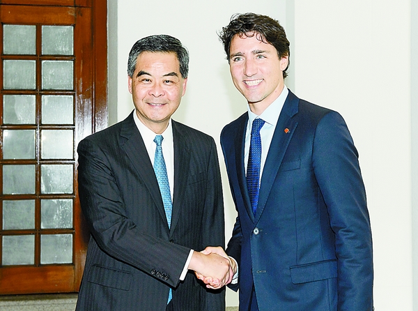 行政长官梁振英(CY)昨日下午在礼宾府与访港的加拿大总理贾斯廷?杜鲁多会面。他期望有更多加拿大企业落户香港,利用香港在「一带一路」倡议下的巨大发展潜力,开拓更多商机。