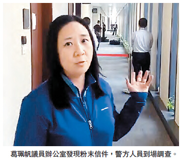 事發現場為金鐘添美道立法會綜合大樓6樓的葛珮帆議員辦事處。昨午3時許,上址收到一封信面印有其名字的匿名信件,內附白色不明粉末及辱罵字條,遂報警求助。警方到場封鎖辦事處作初步調查,由於有2名辦事處女職員接觸過信件,故她們需要隔離檢查。爆炸品處理課稍後奉召到場,經初步調查後,相信白色粉末是麵粉。警方現將案改列求警調查案,交由中區警區刑事調查隊第5隊跟進,正追查發信人身份及動機。