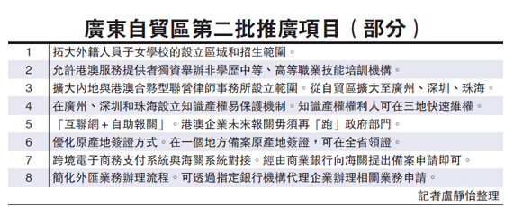 首家港澳與內地聯營的律師事務所今年7月在廣東自貿區揭牌。未來,港澳律師事務所與內地律師事務所在廣東省實行合伙聯營的實施區域將從自貿區擴大至廣州、深圳、珠海市。此外,便利港澳企業快速維護知識產權的保護機制也將拓展到穗深珠三市。