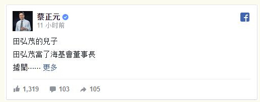 蔡正元昨日在臉書(Facebook)上以主題《田弘茂的兒子》寫道:“據聞田弘茂的兒子叫Marvin Tien ,2008年或更早,就在中國大陸做很多生意,也做地鐵車廂視頻廣告的生意,拿的都是臺灣投資人的錢。公司叫 Reach Media,一年不到,燒光800多萬美金,出錢的都是田弘茂的商場老友,如中興保全的林孝信。”