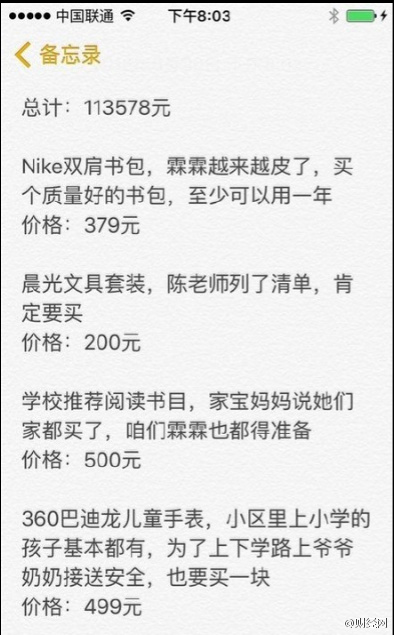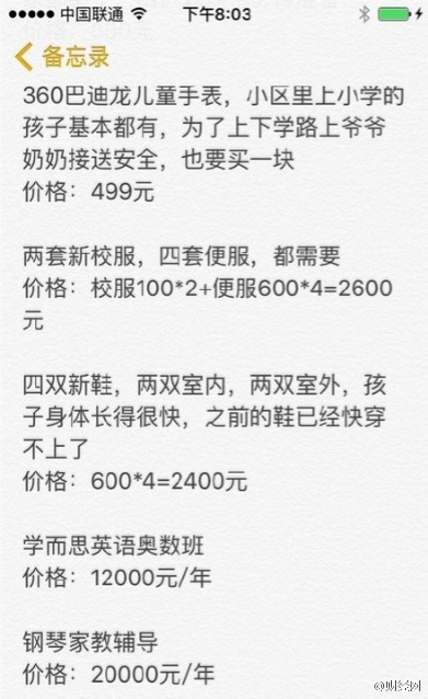 也有網友表示,“天價開學清單”不僅會助長學生之間攀比之風,還會增加孩子的負擔。我們上小學那時候,沒上過這么多培訓班,也沒買過這些名牌產品,每學期只有學費和借讀費、校服費,也照樣從小學讀到高中,從大學念到研究生畢業。小小年紀何必攀比?這樣養大的孩子虛榮心得多強啊!