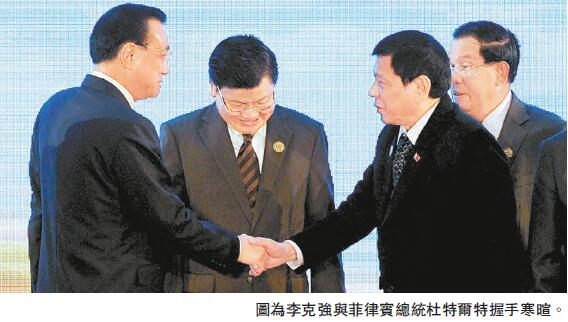 【香港商报网讯】国务院总理李克强昨日在老挝与东盟十国领导人会面,会议通过南海适用《海上意外相遇规则》的联合声明。李克强强调,中方愿与东盟国家携手合作,排除干扰,把南海建设成为造福地区各国的和平、友谊与合作之海。李克强还在台上与菲律宾总统杜特尔特握手寒暄,这是自七月南海仲裁案有结果之后,中菲领导人首次同场出席国际会议。