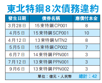 【香港商報网訊】不到半年的時間,遼寧省大型國有企業東北特殊鋼集團有限責任公司(下稱「東北特鋼」)已出現8次債券違約(如下表)。