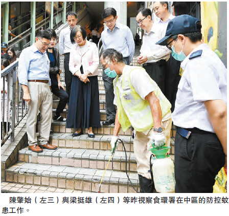 陳肇始昨日聯同衛生防護中心總監梁挺雄、食物環境衛生署防治蟲鼠主任主管李明偉,到中區一帶巡視滅蚊工作。食環署人員在中環至半山扶手電梯近蘇豪區一帶加強滅蚊,包括在伊利近街附近公園草叢及渠位,噴灑防蚊油。李明偉說,署方每星期會在各區地盤巡視,如果發現有蚊蟲滋生,會作出檢控。
