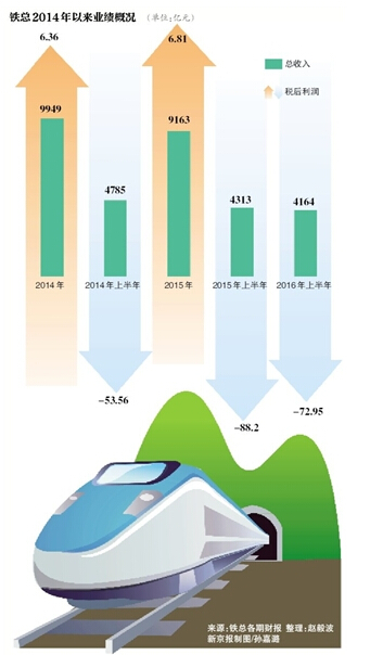 2014年為鐵總改制的第一個完整會計年度。當年上半年,鐵總稅后利潤虧損53.56億元;但到了2015年初公布的2014年財報中,鐵總的稅后利潤由負轉正,盈利6.36億元。2015年延續了該種態勢。鐵總2015年上半年稅后利潤巨虧88.2億元,但全年盈利6.81億元。到了今年,上半年繼續報虧。