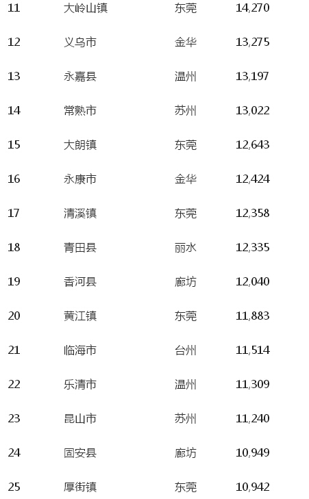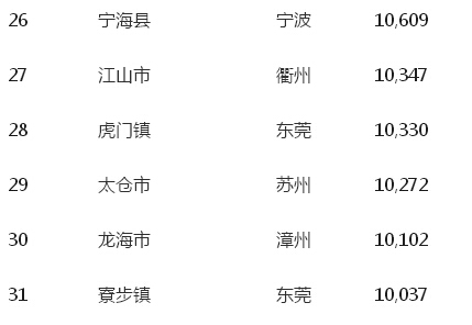 這十個鎮分別是鳳崗、塘廈、長安、大嶺山、大朗、清溪、黃江、厚街、虎門和寮步。其中靠近深圳的鳳崗、塘廈、長安位居所有小城鎮的前十位。