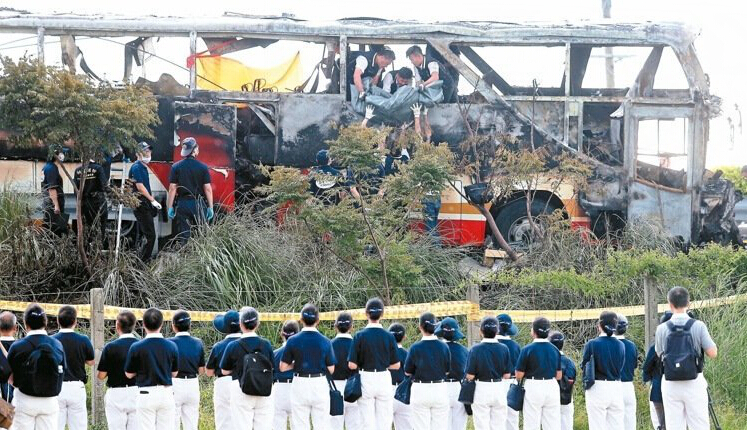 遼寧大連24人旅游團,7月19日結束8天7夜環臺之旅,搭乘玫瑰石通運游覽車,準備赴桃園機場搭機返鄉。游覽車行經離機場僅剩3公里時,車頭開始冒煙,撞擊護欄后起火,游客及駕駛、導游等26人都沒逃出,多具尸體堆疊在安全門及走道上。