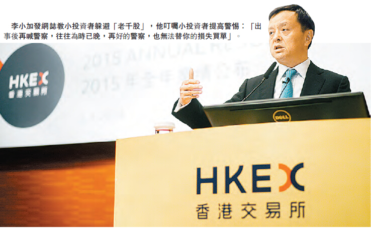 有見及此,港交所(388)行政總裁李小加昨日透過網誌,內附錦囊提醒投資者如何避開「老千股」。他對「老千股」的定義是:主要是指大股東不以做好上市公司業務來盈利,而主要通過玩弄財技和配股、供股與合股等融資方式損害小股東利益。其網誌內容摘錄如下﹕