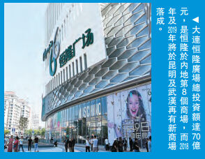 大连恒隆广场总投额达70亿元,是公司於内地的第8个商场,而2018年及2019年将於昆明及武汉再有新商场落成。陈启宗在开幕礼时表示,现时内地商场的经营环境困难,国际大名牌生意正在收缩,开新商场有挑战,恒隆会定时定点做调整。他重申,就旗下上海恒隆广场商户营业额所见,市场有回暖迹象,势头不错,惟能否持续及是否全国范围回暖,仍要观察。