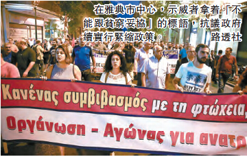 希臘第二大城市塞薩洛尼基約1.5萬人抗議,不滿政府推行緊縮開支。一名示威人士表示,持續緊縮已將他迫向死亡邊緣。政治風險諮詢顧問歐亞集團總經理拉赫曼表示,歐洲南部的經濟和政治上的風險性挑戰繼續增加,雖然希臘政府竭力實行救援計劃試圖渡過經濟危機,希臘激進左翼聯盟(主要政黨)和債權人之間的辯論和2015年發生的并無不同。