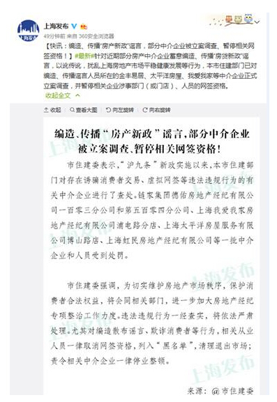 上海市住建委還強調,為切實維護房地產市場秩序,保護消費者合法權益,將會同相關部門,進一步加大房地產經紀專項整治工作力度。違法違規行為一經查實,將依法嚴肅處理。尤其對編造散布謠言、欺詐消費者等行為,相關從業人員一律取消網簽資格,列入“黑名單”,清理退出市場;責令相關中介企業一律停業整頓。