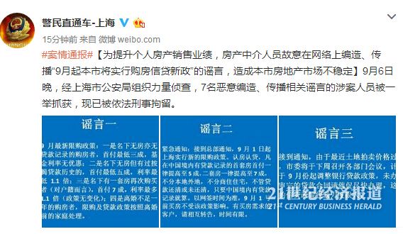 此前9月8日晚,上海市公安局官方微博@警民直通車-上海消息發布消息,稱此前惡意編造、傳播“9月起上海市將實行購房信貸新政”謠言的7名涉案人員已被依法刑事拘留。