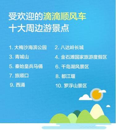 而同樣也受到順風車用戶歡迎的十大潛力周邊游景區分別是深圳楊梅坑、廣州大夫山森林公園、四川峨眉山、湖北武當山、廣東西樵山風景區、山西平遙古城、煙臺蓬萊閣、天津塘沽海昌極地海洋館、安徽九華山、吉林長白山。