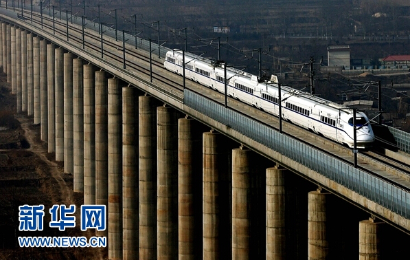 一列試運行的動車組列車從鄭西高鐵三門峽附近的一座特大型橋梁上駛過(2010年1月16日攝)。新華社記者王頌攝