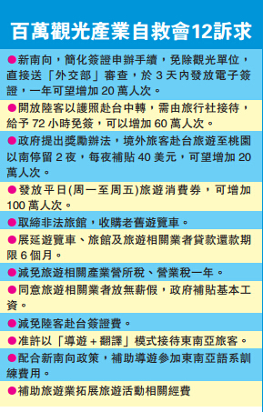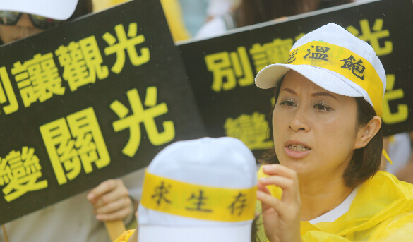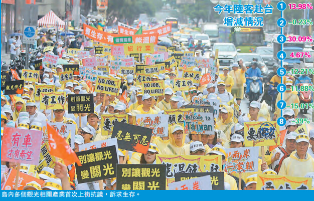 由於大陆观光客锐减,已影响到台湾的观光业,数十万人的生计也受到威胁。包括旅行社、导游、旅馆、游览车、餐厅、礼品业等观光相关产业人员约2万人昨日决定上街游行抗议。冒雨在华山文创园区集合,沿忠孝东路及仁爱路,前往凯达格兰大道的「总统府」外集结,游行队伍拉起写有「要生存、有工作、能温饱」的白色布条,沿途高呼「两岸一家亲」、拚经济、要工作、能温饱、要陆客、别让观光变关光、振兴旅游等口号,并派代表进入「总统府」提交请愿信。主办单位说,今次是台湾观光业界第一次上街。