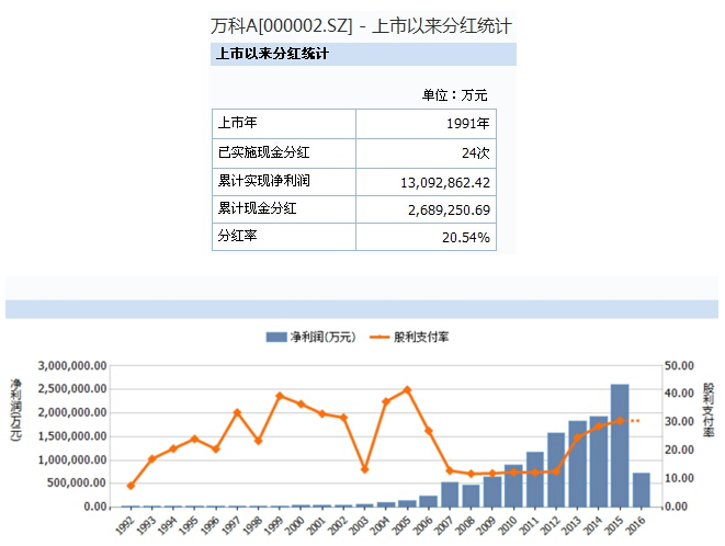 根據廣發證券預測,萬科2016~2018年歸屬母公司凈利潤分別為203.79億元、239.09億元和268.48億元,按照公司最新股本計算,對應的每股收益分別為1.85元、2.17元和2.43元,而139億分紅占凈利潤比例分別為68%、58%、51.7%。