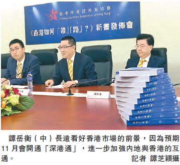【香港商報网訊】港股大跌,昨日收市報跌809點。對於港股市場大幅波動,中資證券業協會會長譚岳衡在出席新書《香港如何「帶」「路」》發布會時表示,市場對美國加息預期一直存在,今次市場波動主要由於早前市場對「深港通」開通的預期,令本港股票累積一定升幅,更令恒生指數一度重返24000點水平。他續指,環球經濟沒有根本改善,加上市場預期人民幣匯率會貶值的影響下,港股沒有持續向上和形成牛市的基礎條件,所以股市出現波動乃是正常的反應。他長遠看好香港市場的前景,因為預期11月會開通「深港通」,進一步加強內地與香港的互通。