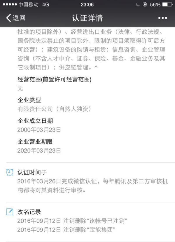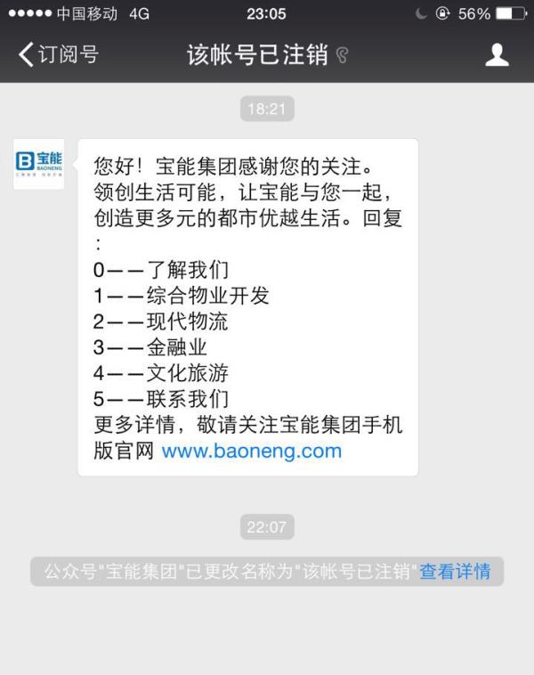 除了刪除文章這一舉動之外,22時07分,寶能集團的官方微信顯示其已更改名稱為“該賬號已注銷”。根據微信公眾號的信息顯示,在9月12日,寶能集團的官方微信號進行過兩次改名記錄。第一次是注銷刪除“寶能集團”,第二次是注銷刪除“該賬號已注銷”。