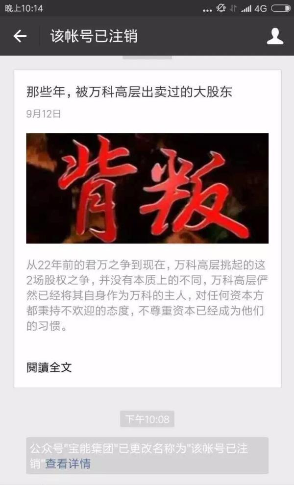 9月12日下午16時38分,寶能集團在其官方微信公眾號上發布一篇名為《那些年,被萬科高層出賣過的大股東》的文章,但隨即秒刪。