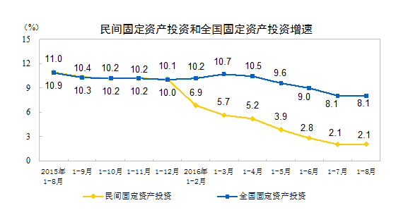 1-8月,民間固定資產投資225005億元,同比名義增長2.1%,增速與1-7月持平。