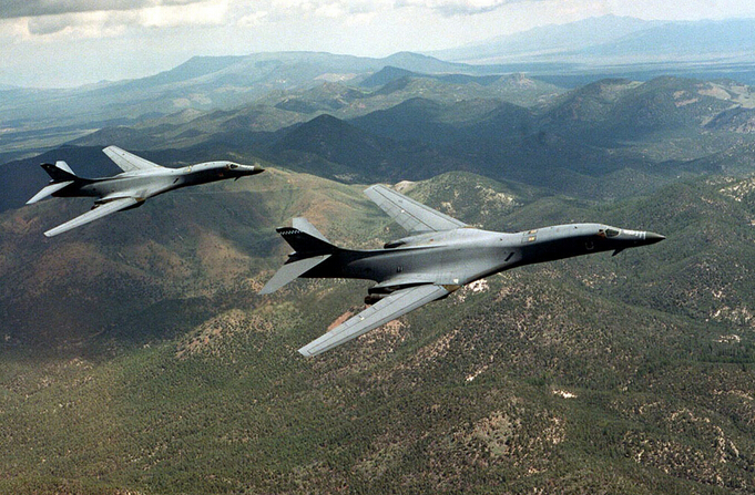 美军B-1B兰斯轰炸机在战斗机护驾下飞行。