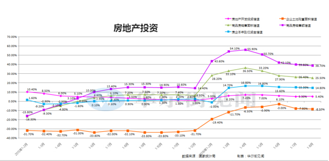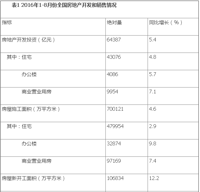2016年1-8月份,全國房地產開發投資64387億元,同比名義增長5.4%,增速比1-7月份提高0.1個百分點。其中,住宅投資43076億元,增長4.8%,增速提高0.3個百分點。住宅投資占房地產開發投資的比重為66.9%。