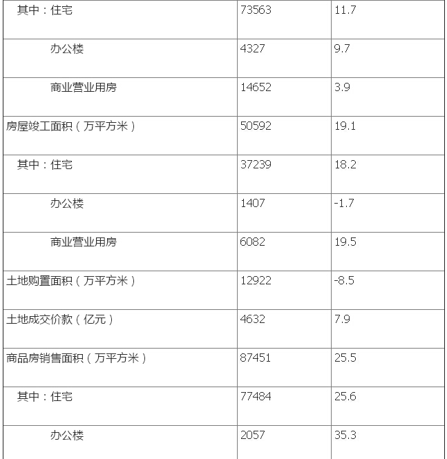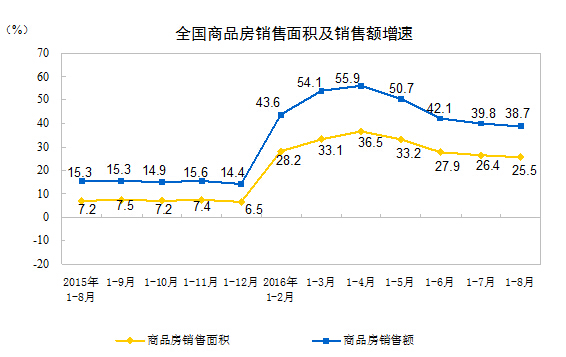 1-8月份,商品房銷售面積87451萬平方米,同比增長25.5%,增速比1-7月份回落0.9個百分點。其中,住宅銷售面積增長25.6%,辦公樓銷售面積增長35.3%,商業營業用房銷售面積增長17.4%。商品房銷售額66623億元,增長38.7%,增速回落1.1個百分點。其中,住宅銷售額增長40.1%,辦公樓銷售額增長56.1%,商業營業用房銷售額增長19.5%。