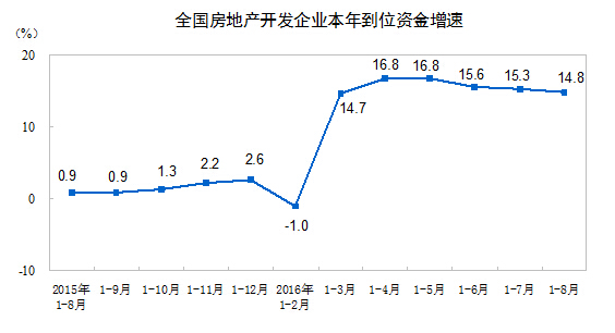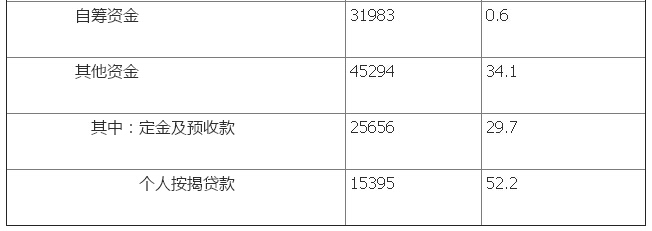 1-8月份,房地產開發企業到位資金91573億元,同比增長14.8%,增速比1-7月份回落0.5個百分點。其中,國內貸款14199億元,增長1.7%;利用外資97億元,下降52.6%;自籌資金31983億元,增長0.6%;其他資金45294億元,增長34.1%。在其他資金中,定金及預收款25656億元,增長29.7%;個人按揭貸款15395億元,增長52.2%。