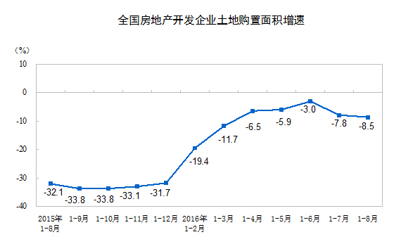 1-8月份,房地產開發企業土地購置面積12922萬平方米,同比下降8.5%,降幅比1-7月份擴大0.7個百分點;土地成交價款4632億元,增長7.9%,增速提高0.8個百分點。