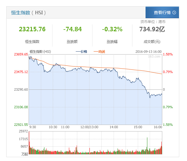 網易財經9月13日消息 隔夜美股集體反彈,三大指數均漲逾1%。恒生指數今早高開273.53點,漲1.17%,報23564.13點。之后走勢逐漸下行,最低見23196.49點。