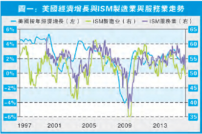 至於耶倫要加息,看的主要是通脹及就業。全球通脹仍處低水平,撇除這點,筆者常言美國就業市場增長應已見頂。如果以制造業及服務業的數據來判斷該兩行業的就業形勢,在圖二的制造業情況上,這廿多年來因為ISM制造業曾多次跌穿50而收縮,此時制造業職位空缺亦減少。但問題是制造業數據曾出現多次如2012年般「假穿」,而當期總體非農職位仍在增長,可見制造業數據令市場增加不確定性,亦令市場錯估就業形勢。