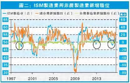 相比制造業,服務業的預測性更可靠。圖三見到在2000年與2007年當ISM服務業跌穿50水平后,總體非農及服務業都同時減少職位。有別於制造業,近幾年服務業持續擴張,而總體非農及服務業亦不斷新增職位,未有收縮,可見整體服務業數據的預測性較強。