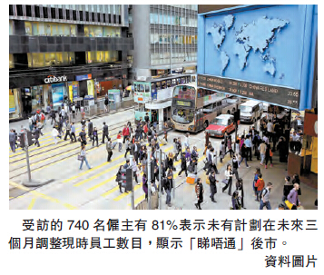 【香港商報网訊】在ManpowerGroup香港2016年第四季「就業展望調查」報告中,受訪的740名戶主有81%表示未有計劃在未來三個月調整現時員工數目,顯示「睇唔通」后市;3%稱有意縮減人手;16%預算將增加人手。來季凈就業展望指數雖然維持審慎而積極的+13%,但招聘意欲較去年同期下跌兩個百分點。