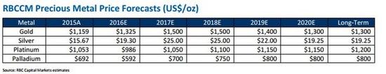 RBC對貴金屬2016-2020年后的價格預測如下表: