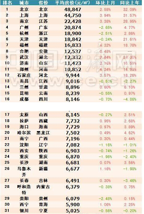 據了解,全國房價排名前十的為北京、上海、南京、廣州、杭州、天津、福州、合肥、武漢、濟南。在31省區中,11地的住宅均價超過1萬,除去北上廣外,南京、杭州、福州、合肥、武漢等這些熱門省會無一例外,全部過萬。