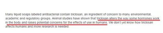 FDA網站上述截圖標紅文字稱:動物實驗表明,三氯生改變了人體內激素(也就是"荷爾蒙")的工作方式,同時增加了對人類潛在健康問題的影響。