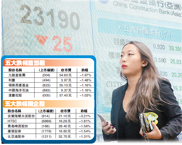 【香港商報网訊】記者伍敏報道:加息預期及油價波動持續困擾大市,加上中秋假期北水「中場休息」,港股昨天反彈乏力,恒指由升轉跌,主板成交跌至609億元,收市跌25點,報23190點,為三連跌並失守20日線23232點,本周以來累跌909點或3.7%。國指則跌28點,收報9542點。後市恒指短線首要任務守穩20天線,惟美議息前仍將呈現大上大落格局。