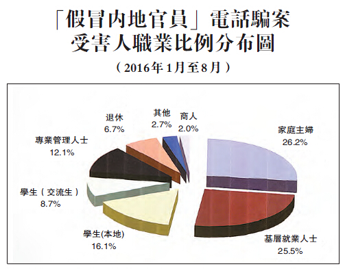 東九龍總區重案組總督察譚威信指出,根據報案數字,同類騙案受害人主要為基層就業人士,部分為家庭主婦,該兩類人士各佔總人數超過四分之一,其餘為大學生、交流學生、專業管理人士及退休人士。譚威信續指,近期電騙案件與早前包括「猜猜我是誰」與「虛擬綁架」等手法不同,亦較少長者「中招」,反而是受害人有年輕化趨勢。