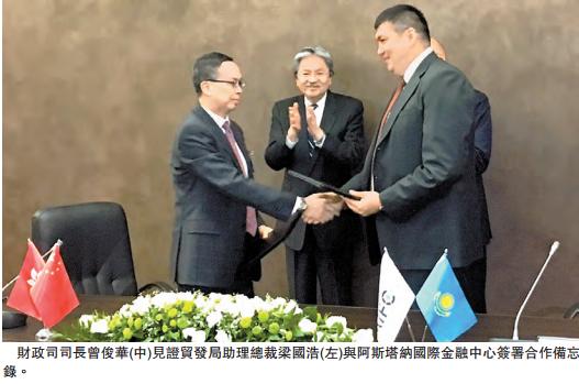此行焦點活動之一是貿發局與阿斯塔納國際金融中心簽署合作備忘錄,協議透過該局的「一帶一路資訊網站」(www.beltandroad.hk) 發放有關哈薩克投資項目的信息,雙方並互相支援在雙方舉辦的考察活動。此外,在財政司司長曾俊華見證下,KTZ Express與香港註冊公司Kazakhstan Potash Corporation (KPC)簽署合作框架協議,建立及發展雙方在國際交通及物流運輸方面的合作。
