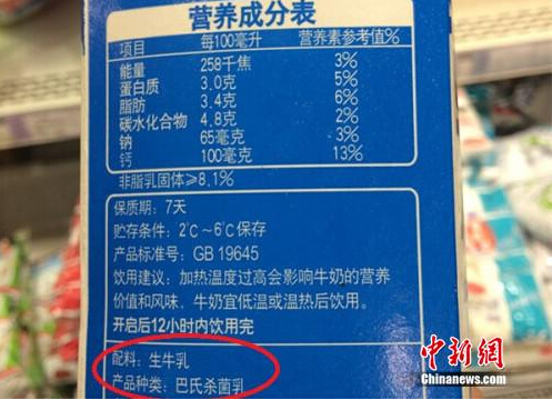 北京某超市銷售的一款巴氏奶,配料顯示為“生牛乳”。中新網 邱宇 攝